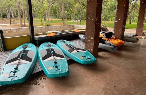 2-Bedroom Unit in a Fun and Free-Spirited Inn Want to stay in a unique inn that embodies the “Keep Austin Weird” aesthetic? Look no further than River Ranch Inn! With its whimsical vibe and rich history, this Inn is the perfect stay for those who want to experience all that Liberty Hill has to offer. Located right next to the South San Gabriel River, this spot is the perfect place to bring your kayak, paddleboard, and fishing gear! Our Inn has eight units. This unit has two bedrooms, a full bath, and a kitchenette. Each room has its own bohemian theme, and the entire space can comfortably accommodate up to FOUR guests. If you have MORE in your party please feel free to message me and I can send you links to the other units. The main bedroom is a light and airy Moroccan-themed room with a king-sized bed. It comes with a dresser for storing your clothes. It also has a TV to unwind at the end of the day. The warm and inviting second bedroom comes with a queen-sized bed. Our full bathroom comes stocked with fresh linens for your comfort. While Liberty Hill has amazing eateries (we highly recommend Hell or Highwater Brewery and Agape BBQ!), sometimes nothing beats a quiet meal with your friends after a day of fun. Whether unwinding at the end of the day or grabbing a quick bite in the morning before heading out, our convenient kitchenette will meet your needs. The kitchenette comes stocked with all the essentials for a simple meal. Just bring your food! Some items included: • Blender • Cups and mugs • Coffee maker • Microwave • Refrigerator • Plates and cutlery The kitchenette also has a small table and four chairs to relax for your meal. Or feel free to eat and hang out in the common area on the ground floor! While you are here, the unit is your private oasis. Feel free to use the amenities in the room. The ground floor does have a common area to hang out with other people staying at the Inn, charcoal bbq grills, and is where we store the washer and dryer. The river does allow fishing, kayaking, and paddleboarding, so bring your equipment to enjoy! Also, bring chairs to relax by the river. Due to the current pandemic, we have enhanced our existing cleaning protocols. In addition to our comprehensive cleanings between every stay, all surfaces inside the house, including door handles, light switches, counters and tabletops, devices, handrails, and appliances, are cleaned with a CDC-approved disinfectant. Our guests’ health, safety, and well-being are our top priority. Our calendar is filling up quickly, so book your unforgettable getaway today. We hope to host you soon!