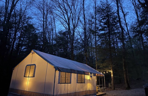 Welcome to The Snoopy Tent at Brookledge—a cozy, offbeat glamping retreat tucked along a quiet stream on 60 private acres. This isn’t your average tent. Think real beds, electricity, fresh linens, and peaceful forest sounds all around. Located just 12 miles from Saratoga Springs and SPAC, you’ll enjoy a nature-immersed stay with modern comforts.