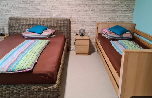 Die Untere Ferienwohnung hat 70 qm im Erdgeschoss. Sie ist ausgestattet mit 2 Terrassen und einem Wintergarten. Ein Schlafzimmer für 1 - 3 Personen mit einem 1,40 m Bett und einem 90 cm Bett. Bei Wunsch nach getrennten Schlafmöglichkeiten kann ein Bett im Wohnraum und ein Bett im Wintergarten (nur in der warmen Jahreszeit) aufgestellt werden. Die Wohnung ist rollstuhlfreundlich (bitte nur nach tel. Rücksprache buchen!), hat ein Bad mit Dusche (für Rollstuhlfahrer nur mit Hilfe), Toilette mit Griff, Waschbecken. In der offenen Küche finden Sie Herd mit Backofen, Mikrowelle, Spülmaschine, Kühlschrank. TV und WLAN vorhanden.