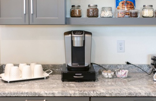 Kitchen offers a Keurig coffee maker, French press, air fryer and ninja blender.