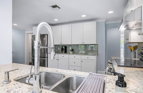 Just blocks from the beach in Old Naples, this recently renovated 3BR/2bath is just a short stroll to beach access directly at the end of the street. Enjoy a full day in the sand or pop over to catch a breathtaking sunset. If high-end shopping, dining and entertainment is on your priority list, head just a few minutes away to land directly in the heart of 5th Ave S. If a relaxing day with friends or family is needed to take a break from the sand, the backyard pool is heated and landscaped for complete privacy. If not dining out on 5th Ave, pick up some world class imported Japanese and Australian wagyu steaks at Jimmy P's and grill out by the pool. The kitchen is fully stocked to prepare any meal. There is a large capacity wine cooler, plenty of glassware, and a cozy sitting room to enjoy a beverage alongside expansive floor to ceiling windows with lots of natural light. All amenities included (shampoo, conditioner, body wash, hair dryer, plenty of towels for the showers as well as for the beach). Of course, all of the essentials like WiFi, AC, and a washing machine/dryer... Just pack your toothbrush and clothes and come enjoy your time in Old Naples at our new home.