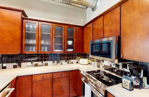As you enter this unique escapade, you will discover a spacious open floor plan with an incredible skylight, 11-foot ceilings, and new flooring. Make yourself at home and spread out comfortably in the living area, furnished with an inviting sofa and a smart TV with streaming services such as Netflix, ESPN, Prime Video, Hulu and Disney to stay up to date with your favorite series. The living area also offers access to an outdoor patio with an outdoor dining area overlooking the city. Surprise your guests and treat them to exquisite homemade meals prepared in the well-equipped kitchen, complete with all-new stainless steel appliances. The main floor houses a laundry area with a washer/dryer and one bedroom while the second floor features a second bedroom. Additional perks include custom walk-in closets, high-speed WiFi, and central AC.