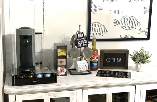 When you walk in the kitchen will greet you with vaulted ceilings and wood beams. The kitchen is equipped with new stainless steel appliances, quartz counter tops, tile backsplash, and plenty of dishes, silverware and cookware.