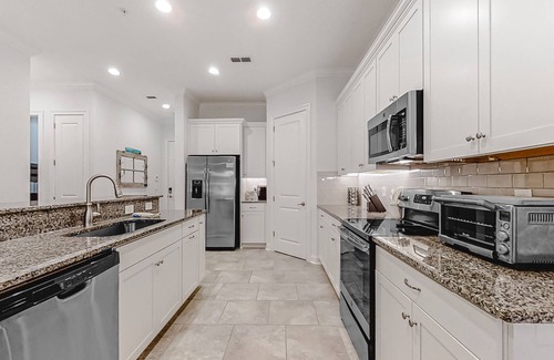 Summerwoods is a gated community with each guest having their own driveway to park one car. This ground-floor townhouse has all new furniture and stainless steel appliances in the kitchen. The fully-equipped kitchen also boasts a Keurig coffee maker and a toaster oven/convection oven. The back screened-in concrete porch has a bistro table with two chairs. The guest bedroom is towards the front of the townhome and has one full over full bunk bed and twin trundle. There is a bathroom with a walk-in shower next door to the guest bedroom, not connected. The primary bedroom is towards the back of the townhome (off of the living room) and has one queen size bed with a large primary bathroom attached. The main bath has a step-down walk-in shower.