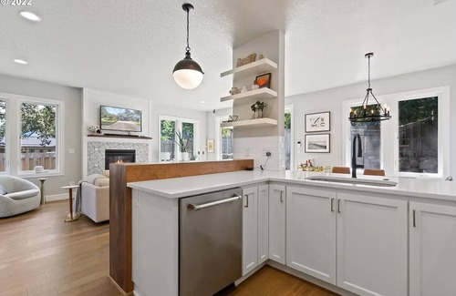 This two bedroom family home is right in the middle of Lake Oswego in a very quiet neighborhood. 3 blocks to George Rogers Park and New Seasons market. One block to Freepons park. All bedroom furniture is brand new featuring 2 king beds. You will love the gathering spaces in the home, watching TV in the warmth of the gas fireplace. Brand new outdoor covered patio. Restoration Hardware decorations, 3 new TV's, amazing kitchen and dining room.