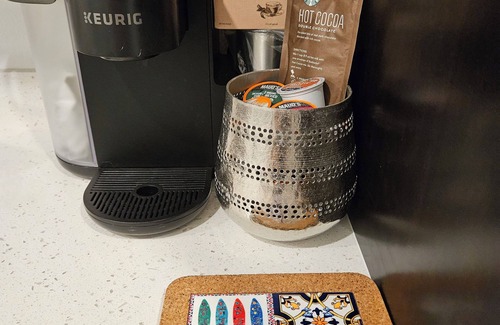 Kitchenette: all-in-one microwave/airfryer/convection oven, complete kitchenware, complimentary refreshments.