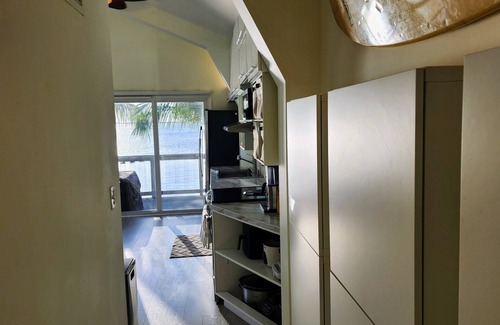 The living room and kitchen imbue tranquility with the peaceful views of the ocean. Watch as birds and boats cruise by, as well as the occasional manatee! With a Sonos surround sound system, you will be sure to enjoy your time here with high fidelity sound. Our kitchen is stocked with everything you need from cutlery to pots, blender, coffee maker, and more. Our Transformer Table can expand or shrink depending upon your needs (seating 1 to 10 people). The kitchen island can also be moved to suit your needs of this space, such as doing a sunrise group yoga session. This house is very flexible and allows for a lot of versatility!
