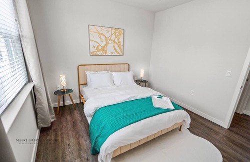 The apartment is beautifully furnished with modern decor and high-end finishes, including a comfortable queen-sized bed, plush linens, and a 50 inch flat-screen TV. The living room is tastefully decorated and features a cozy sofa and armchair, perfect for unwinding after a day exploring the city. The kitchen is fully equipped with all the necessary appliances, including a refrigerator, stove, microwave, and dishwasher, making it easy to prepare your favorite meals.