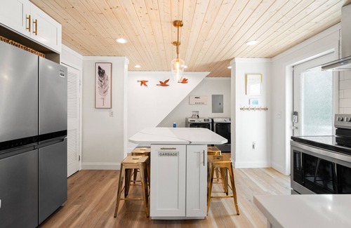 Custom light filtering blinds and warm wood ceilings with mood enhancing recessed lighting on dimmers throughout set the stage for relaxation. The spa bathroom with walk-in shower featuring art deco tile, dual showerheads, recessed lights, and integrated blue tooth speaker is an experience in itself!. The kitchen makes at home dining a pleasure with modern cabinets, quartz counters, and a generous island for food preparation and entertaining. The living room with a cozy sectional and reading nook invites leisure. Smart TVs, WIFI, and a laptop station meet business traveler’s needs as well. This loft is part of the “Blue Enchantmint” a historic building full of wonderful architectural features and host to a few lovely businesses on the lower level (house plants, alternative wellness products, and massage therapy) With separate entrances and a nice cozy layer of insulation between both floors you will find peace and quiet, but also have the opportunity to enjoy delving into the offerings below. Urban Nest is part of the newly emerging Butler Women of Washington District (Boutique Lodging, Wellness, and Shopping district). Should you like to indulge in a wellness or relaxation experience ”Thyme and Mint” was curated within our district to offer personal wellness retreats and intention collections. Our luxurious accommodations are perfect for a romantic weekend, a girls getaway, or a “me” time retreat. There are stairs to enter into your loft/Urban Nest.