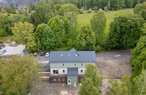 Mezná: Child friendly, modern, cosy residence "V kapradí", 3 storeys, built in 2025, surrounded by trees. 4 apartments in the property. In a quiet, sunny, elevated position, 600 m from the river, in the countryside. For shared use: property 1'000 m2. Patio, garden furniture, barbecue, children's playground (slide, sandbox). In the house: WiFi, central heating system, burglar alarm system. Storeroom available. Parking (for 6 cars) at the house, public parking 200 m on the road. Shop 2 km, grocery 2 km, supermarket 5 km, restaurant 400 m, bicycle rental 5 km, bus stop "Hřensko, Mezná" 500 m, thermal baths "Bad Schandau" 18 km. Golf course (9 hole) 6 km, cross country ski track 6 km. Nearby attractions: Soutěsky Hřensko 1,8 km, Pravčická Brána 2 km, Skalní hrad Šaunštějn 5 km, Dolský Mlýn 7 km, Jetřichovické vyhlídky 10 km, Skalní hrad Falkenštejn 10 km, Bad Schandau (D) 16 km, Adrenalin park Jedlová 27 km.
