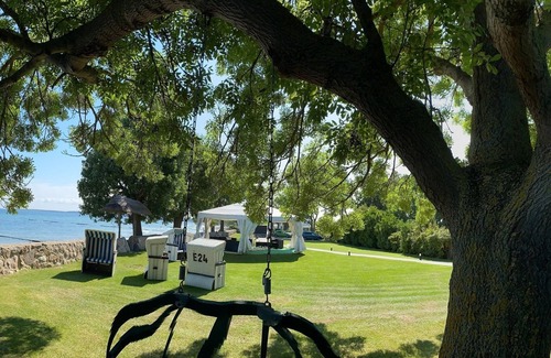 Families with children in particular will appreciate the spaciousness of our property. Football, garden chess or romp on your own children's playground. No problem on our 2000m2 garden plot. Nevertheless, everyone can still find their quiet spot on the huge sunbathing lawn, lounge terrace or in our barbecue area. Due to the natural stone wall that borders the property to the beach, the children are also safe to play and run around.