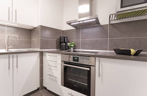 The kitchen is equipped with an oven, a refrigerator, and a dishwasher, as well as a coffee maker, a microwave, and a toaster. Enjoy the internet and TV. Other amenities at this 1-bedroom, 1-bathroom rental include an ironing board and heating.