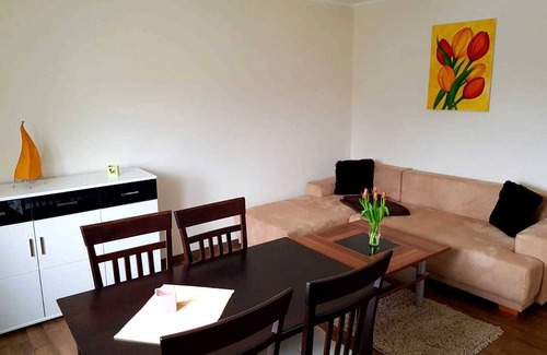 Equipment: The 2-room apartment is equipped with modern laminate. The apartment consists of a small entrance hall with cloakroom, a kitchen, bathroom with window, living room and bedroom. The wall surfaces are smoothly trowelled and painted in a bright, friendly color. The rooms have large windows for plenty of natural light. Bathroom with corner bath, large vanity, window and washing machine. The kitchen is fully equipped. The living room has modern furniture, a comfortable corner couch (fold-out) and dining table with 4 chairs and flat-screen TV. Small, loving details make the apartment very comfortable. Bedroom with 1 large double bedThe apartment has bed linen and towels. Non smoking