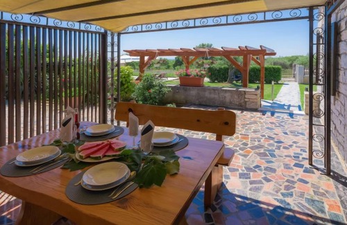 Sv.Lovreč 12 km from Poreč: Beautiful single-family house "Blog 2". In the hamlet Vošteni 2 km from the centre of Sv. Lovreč, in a quiet position, 7 km from the sea, in the countryside. For shared use: children's playground (slide, swing). Private: property 500 m2 (fenced), garden, swimming pool angular (9 x 4 m, 40 m2, depth 140 cm, seasonal availability: 28.Mar. - 17.Oct.) with internal staircase. Outdoor shower, hot tub, barbecue, children's playground. In the house: internet access, washing machine. Parking at the house on the premises. Shop 2 km, supermarket 12 km, restaurant 150 m, bus stop 5.3 km, pebble beach 12 km, rocky beach 12 km. Walking paths from the house 50 m, cycle lane 100 m. Nearby attractions: Lim valley 7 km, aquapark 17 km, amusement park 17 km. For shared use: children's playground (slide, swing) at 30 m. Possibility of buying autochthonous food products (on request, extra).