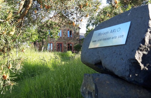 Maison ARLO is located on the edge of the small Eifel village of Sassen (approx. 80 inhabitants) at around 600 meters above sea level on the slope of an extinct volcano. Surrounded by a garden with a orchard, the apartment is south facing and offers a beautiful distant view. We converted the old quarry stone barn into a holiday apartment in 2015 - 2017 and is part of a listed building ensemble. Only ecological building materials such as clay, historic lime plaster and woods from the region were used in the renovation.