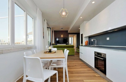 Beautiful, extravagant, and welcoming 90 sqm three-room apartment located on the 7th floor (with two elevators), open space, living and dining room, kitchenette, two bedrooms, two bathrooms, and an amazing terrace.