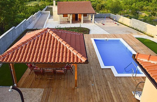 Single-family house "Julija", 2 storeys. In the hamlet Grabovci 11 km from the centre of Vodice, in a sunny position, 8 km from the sea, located by a road. Private: property 3'500 m2 (fenced) with lawn 100 m2, swimming pool angular (25 m2, depth 140 cm, seasonal availability: 01.May. - 15.Oct.). Outdoor shower, pool house with fridge, WC and cooking stove, table tennis, boules, arbour (20 m2), terrace (80 m2), garden furniture, barbecue, children's playground (slide, swing). In the house: internet access, sauna, hot tub, table football, central heating system, washing machine. Available: boat (extra). Room cleaning on request (extra). Airport transfer (extra). Roofed, parking (for 3 cars) at the house on the premises. Shop 10 km, restaurant 8 km, bus stop 9 km, pebble beach 12 km, public bathing area 12 km. Cycle lane 6 km. Nearby attractions: NP Krka 30 km. Well-known lakes can easily be reached: Vransko jezero 20 km. On request: airport transfer to the holiday accommodation.