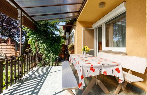 Balatonfenyves 28 km from Keszthely: Comfortable semi-detached house "Kaiser" in 2020. In the resort, 600 m from the lake, 650 m from the beach. For shared use: property 500 m2 (fenced), well-kept garden with lawn and plants. In the house: WiFi, air conditioning, washing machine. Grocery 150 m, supermarket 2.5 km, restaurant 150 m, café 600 m, railway station "Balatonfenyves Alsó" 500 m, ferry "Szántód Rév" 47 km, grass beach 650 m, thermal baths "Csiszta" 12 km. Sports harbour 2.5 km, marina 2.5 km, tennis 2.3 km, cycle lane 500 m, children's playground 500 m. Nearby attractions: Sipos-hegyi Lookout Tower 10 km, Hévíz Thermal Lake 30 km. Please note: the owner lives on the same property.