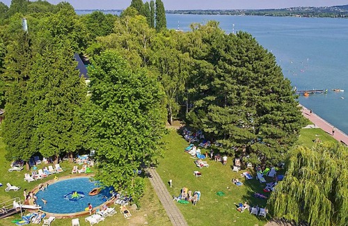 Tihany 8 km from Balatonfüred: Child friendly, cosy holiday village "Kalmar". In a quiet, sunny position, from the lake, 350 m from the beach, direct access to the beach, in the countryside. For shared use: park 13 ha (fenced), flowers and trees, lawn for sunbathing, indoor pool angular (25 x 10 m, 250 m2, depth 130 - 130 cm). Shower/WC in the pool area, children's pool, slide, outdoor shower, private beach, hot tub, tennis (4 x clay court) (extra), volleyball, badminton, children's playground (slide, swing, sandbox). In the house: reception, restaurant, bar, sauna, fitness room, steam room, hot tub (all included), infrared sauna, bowling (extra). Table tennis (extra). Boutique, kiosk, bicycle rental. Linen change (suppl. charge extra). Towel change (suppl. charge extra). Room cleaning on request (extra). Breakfast and half board possible on request. Parking (extra) on the premises. E-charging station. Shop 200 m, supermarket 8 km, restaurant 150 m, bar, café, ferry 250 m, grass beach 200 m. Sports harbour 500 m, golf course (18 hole) 9 km, surf school 100 m, sailing school, indoor tennis centre, riding stable 2 km, walking paths from the house 400 m, cycle lane 150 m, children's playground 100 m. Well-known lakes can easily be reached: Hévíz Thermal 70 km. Please note: reception open 00:00-24:00 hrs. Entertainment in the season. Baby equipment on request (extra). Object suitable for 2 adults + 2 children. 24hr guard.