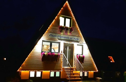 The holiday home "So close to heaven" is a 150m² chalet with five bedrooms on three floors. Core renovation, reopening March 2020. Located directly at the Oberberg golf course at 400 meters above sea level. Two balconies and two terraces with a fantastic view of the Bergisches Land invite you to linger. A large living room with an open, top modern kitchen, large dining table for 12 people and box-spring sofa bed form the heart of the house. In the attic there are two bedrooms, each with 2 box spring beds and a guest toilet. Three further bedrooms, each with a double bed (180x200), are located in the basement. There is also the luxurious bathroom with a large corner bath, toilet and experience shower. Another bathroom with shower and toilet can be found on the ground floor,