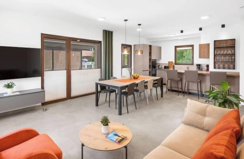 Very beautiful single-family house "Villa Karina", 2 storeys, built in 2022. In the hamlet Kadumi 5.5 km from the centre of Poreč, in a sunny position, 6 km from the sea. Private: property 1'100 m2 (fenced), swimming pool angular, heated (8 x 4 m, depth 150 cm, seasonal availability: 01.May. - 31.Oct.) with internal staircase. Outdoor shower, volleyball, badminton, barbecue, children's playground (slide, swing), pool maintenance by the owner/gardener. In the house: internet access, washing machine. Parking (for 4 cars) at the house on the premises. E-charging station. Shop 3 km, supermarket 3 km, restaurant 500 m, pebble beach 6 km, rocky beach 6 km. Walking paths from the house 100 m, cycle lane 150 m. Nearby attractions: Aquapark 5 km. Please note: suitable for families. The owner does not accept any youth groups. Swimming pool heated (extra). Outdoor kitchen (refrigerator).