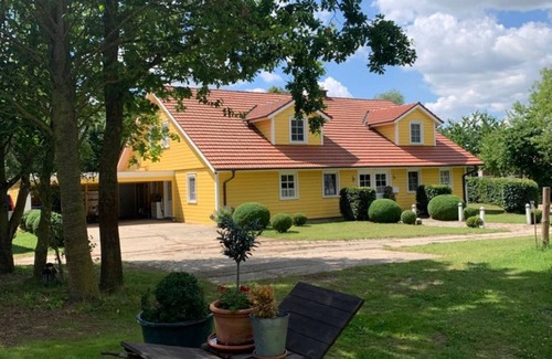 The complete first floor of our 310 m2 two-family house, in which the great apartment is located on our horse farm, is one of the largest, comfortable apartments in Mecklenburg-Western Pomerania with 4 bedrooms. There is also a large sofa bed in the living room. You also have a large kitchen with a new, modern fitted kitchen and a huge dining area (large dining table with comfortable, solid chairs).