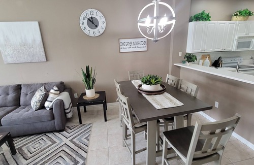Beautiful kitchen with newly painted white cabinets and countertops equipped with everything that you need to make your stay comfortable and pleasant. There is a large size fridge with ice dispenser, stove, microwave, dishwasher and Keurig Coffee Maker as well as all the plates, pots, pans and utensils. Separate dining area with table and chairs and a gorgeous bar with barstools to everyone’s liking.