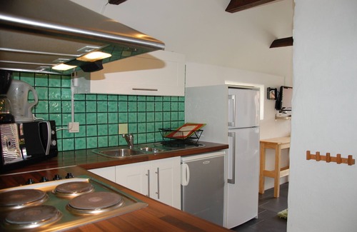 Kitchenette with stove, microwave, oven, fridge, freezer, extractor fan, dishwasher, hot / cold water, coffee maker.