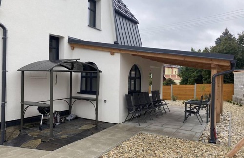 Very beautiful villa "Velké Losiny", 2 storeys, built in 1930, renovated in 2021. 2 apartments in the property. In the resort, 500 m from the centre, in a quiet position, 8 km from the skiing area, in a cul-de-sac. Private: property 750 m2 (fenced), garden. Terrace, garden furniture, barbecue, children's playground (slide, swing). In the house: storage room for skis, central heating system, washing machine, tumble dryer. Parking (for 6 cars) on the premises. Grocery 600 m, supermarket 700 m, shopping centre 10 km, restaurant, café, bus stop 900 m, railway station "Velké Losiny" 900 m, 500 m, thermal baths "Velké Losiny" 500 m. Tennis 9 km, minigolf 700 m, sports centre 9 km, walking paths from the house, cycle lane 100 m, ski lift 8 km, chair lift 10 km, skisport facilities 10 km, slopes 8 km, ski rental 10 km, ski school 10 km, children's ski school 10 km, cross country ski track 8 km, children's playground 1.5 km. Nearby attractions: Termály 500 m, Muzeum papíru, ruční papírna 1 km, Zámek Velké Losiny 1.8 km, Šumperk 11 km, Vodní nádrž Dlouhé stráně 20 km, Jeseník 35 km. Well-known ski regions can easily be reached: Kouty nad Desnou 10 km, Červenohorské sedlo 20 km, Praděd 50 km. Hiking paths: CHKO Jeseníky.