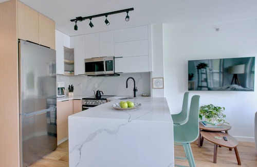 Stylish, tropical studio with luxe finishes, smart tech & fast Wi-Fi. Perfect for working travelers. Steps to English Bay, Granville ferry & cafés. A serene, high-end escape in the heart of Vancouver.