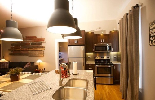 Designed by Victoria Freeman, guests enter the studio apartment into a welcoming living room, where much of the historic floorplan has been honored and retained. The cozy sofa and two chairs form a lovely conversation area, while convenient coffee and end tables make it simple to enjoy a beverage or snack. You'll love the unusual artwork created by a local artist. Boasting plenty of light, you'll probably want to break out the novel you've been planning to read. Or you'll decide instead to stream your favorite show or a movie on the Smart TV with Hulu+Live TV with no ads using our Gigabyte high-speed internet.