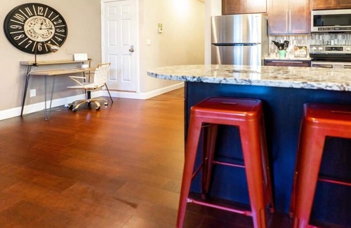 Our designer apartment is retrofitted with all of the luxuries, comforts, and amenities you can imagine. An open floor plan fuses the spacious living room and kitchen to create a warm and inviting space where you can spend quality time with loved ones whether you’re cooking or lounging.