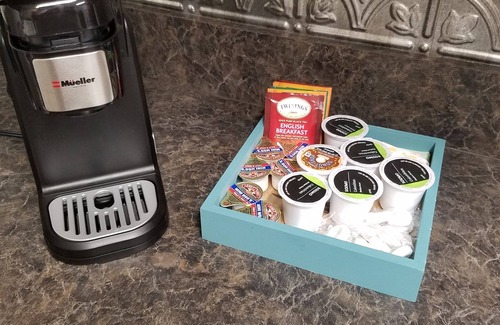 The kitchen comes fully equipped with coffee maker, coffee grinder, French press, pod coffee maker, blender, mixer, crock pot, air fryer, waffle maker, egg cooker, rice cooker, stovetop Moka espresso maker, espresso cups, a milk frother, cookware, utensils, bakeware, glassware, a number of basic spices, starter coffee pods, tea bags, and creamer/sugar, dinner service and flatware for those who enjoy (gasp!) actually cooking on their holidays. (I do.) Thanksgiving and Christmas guests will even find a turkey roaster to prepare their holiday meals. We even have an electric kettle for our European friends.