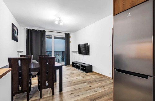 View Of The City Skyline Apartment is located in a modern building, and the apartment itself is after a complete renovation. The apartment is practically and modernly furnished: a living room with a kitchenette, a comfortable bedroom and a bathroom. Guests have a variety of amenities at their disposal, including: refrigerator, toster, washing machine, free Wi-Fi, TV and kitchen accessories. A cozy balcony and a beautiful view of the city skyline complete the accommodation.