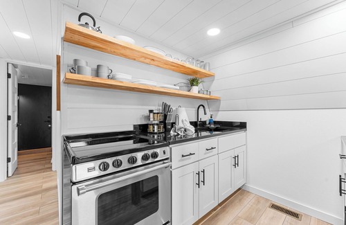When you're ready, open the front door and enter a bright, modern living room/kitchen featuring a large window and those soaring A-Frame ceilings. You will find a modern leather sofa, a mid-century modern lounge chair, and a large Smart Roku TV over a sleek fireplace. The room is complete with plenty of throw blankets to get cozy while you binge-watch your favorite shows, curl up with a good book, or simply watch the flames dance in the fireplace. The full kitchen includes granite countertops, peninsula seating for two, stainless steel appliances, and all the essentials.