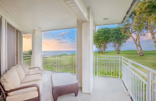 Emmalani Court Unit #110 is the only 3 bedroom condo with AC on the cliff in Princeville! You will notice the absolutely amazing views as soon as you walk in. This peaceful location allows ocean views from every bedroom and the living space. This ground floor unit is very spacious with over 1,700 sq ft of living area and 250 sq ft of Lani space, only 1 unit above, no other common walls. It is surrounded by the famous Makai Golf Course and looks out at the signature hole. The endangered ne ne birds frequent the area and the Bali Hai sunsets are stunning! The living room, dining room and huge kitchen have an open concept that is great for large groups. We recently purchased this unit and it features many new items including linens. I believe this is the first time the unit will be a rental and it is a wonderful opportunity to spend your vacation at this truly unique home! We have everything you can ask for, including, upgraded mattresses, shampoo/conditioner, spa robes and baby gear (pac n play/stroller). Beach gear includes, cooler, chairs, umbrella, body boards and snorkel gear. The kitchen has all the equipment you need for small to major holiday meals. Rice/slow cooker, Coffee maker and Keurig too. The common area has a wonderful pool, hot tub, lending library and multi purpose room. Plus there is a gas BBQ and large outside table.