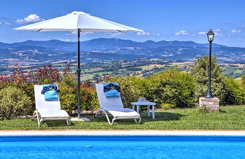 We are in Massa Martana, a delightful little gem, protected by surrounding mountains in the greenest heart of Umbria. Set in absolute tranquility is Villa Bella, a beautiful, stone-clad farmhouse. Despite being recently built it has maintained intact the unique charm of Umbrian farmhouses thanks to the recovery and use of local materials, such as terracotta floors and wooden ceiling beams. A charming location with rooms that are comfortable, spacious and tastefully furnished with great attention to detail. The marvellous swimming pool, with its boundless view, is surrounded by olive trees, a lawn and many fragrant and coloured blooms. Two spacious porticos with wood oven and built-in barbecue, a well-tended garden and a parking area - all set in unspoiled nature. Close to the villa is the Church of the Ascension with an extraordinary panoramic view over the surrounding valley that stretches as far as the eye can see to the rolling, sometimes wild, hills of the Monti Martani. These latter can also be admired along the trails of the Martani Trekking, equipped nature itineraries that have been developed in this area. So a perfect holiday for those who want to relax, immersed in spectacular nature but, at the same time, without relinquishing any comforts. Villa Bella is located just 7 km from the E45 highway with links to Umbria, Tuscany and Lazio. Just a few kilometres away are many attractions for guests to visit: Todi, Orvieto, the Santuario dell'Amore Misericordioso (Sanctuary of Merciful Love) in Collevalenza, Perugia, Assisi, Spoleto, Narni and the Marmore Waterfalls.