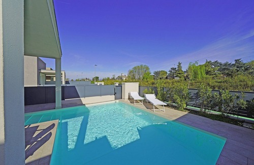 Villa Botego 21 is a newly constructed property with a private infinity pool and terrace, situated in a peaceful area of Sirmione near the picturesque Lake Garda. This modern villa is part of a recently developed complex of terraced houses, offering a stylish and comfortable retreat for guests.