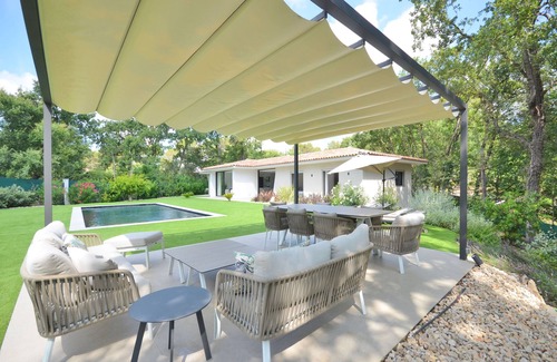 Located in a peaceful Provencal village, less than 15 km from the Mediterranean Sea in the golden triangle between Nice, Cannes and Grasse. This beautiful, modern and brand new flat has been furnished to a high standard. The flat is part of a larger villa and has been completely privatized for you with its private entrance, kitchen, living room, private outdoor lounge area, and access to the main garden with sun terrace, pergola for outdoor dining, and 11x4 meter pool.