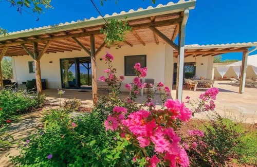 This villa features a private outdoor area with a pool (which can be heated upon request and is available for an extra fee), a jacuzzi, a private garden, an open terrace, a covered terrace, and a barbecue. The outdoor area is fully furnished and ideal for relaxation or outdoor dining.