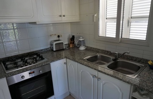 The entire living space is distributed on the ground floor. At the entrance there is an inviting porch, nicely furnished with sofas, ideal for relaxing in the shadow. The ample lounge offers a dining area, a fireplace, gas central heating and Sat TV (with some English channels). The kitchen is just aside and perfectly equipped with oven, microwave, coffee maker, toaster, large fridge-freezer. From the lounge you get to the 2 bedrooms (one with a king-size bed, the other one with 2 single beds), both with air conitioning and a bath room en-suite, one of them with a bath tub and the other one with a shower. Both bed rooms have direct access to another covered terrace with barbecue area. An external staircase leads up to the sun terrace with amazing sea views.