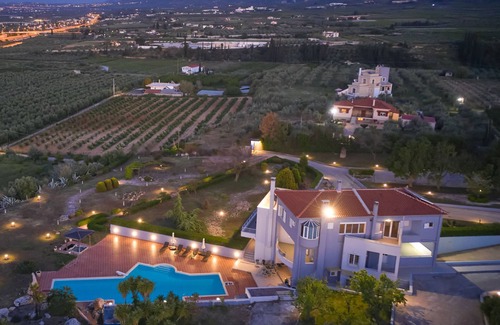 Villa Dennis is located near Vrahati and Korinthos. It is a luxurious complex of a main house and guest houses in a property of 3 acres overlooking the bay of Corinth. The outdoor facilities include a long swimming pool, a BBQ, a jacuzzi, sunbeds, couches and sun shades, a bar and a lounge. This unique villa is only 100 km from Athens. It has 10 bedrooms for 20 guests, 10 bathrooms, 3 dining areas, two fully equipped kitchens, 2 indoor jacuzzis and a patio with pool views.