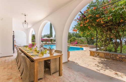 This beautiful, colonial-style Villa dos Ciprestes is hidden between the green of the 10,000 m2 subtropical and flowery garden. In and around the house there is a serene, almost oriental atmosphere, with several great views to the ocean and at night to the twinkling lights of coastal towns like Faro. The villa owes its name to the more than 200 cypress trees that were once planted, many of them along the 150-meter long driveway... The villa belongs to our most luxurious offer, because of the very high level of finishing, the large spaces, the completeness of the furnishings and facilities, the beautiful garden with large pool and the tasteful styling both inside and out. The covered veranda with its attractive arches is enchanting, especially in the evening, when the garden including the pool is illuminated. The house is also suitable for children, they can enjoy swimming or roaming through the enclosed tropical garden.* There is a bocce court and table tennis table. In the garden there are many flowers and Mediterranean fruit trees such as orange, lemon, plum and fig, where you can pick the fruits.