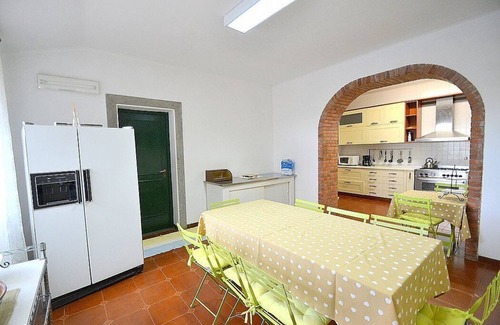 You will be able to enter the kitchen from the dining room. It is well equipped, with a five-burner gas cooker, two electric ovens, an American-style refrigerator with ice-maker, a dishwasher, a microwave oven, an Italian-style coffee-maker, an American-style coffee-maker and other small appliances. The dining table can accommodate ten guests. The kitchen has two windows with a view of the greenery, and is equipped with an air conditioning/heating unit.