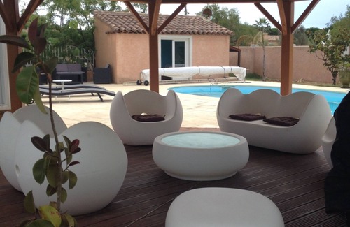 The private swimming pool facing south (10 * 5) with a bench seat and a gentle downhill slope (small pool 1. 10 m deep to the plunge pool 1. 80m deep) equipped with a system of Volumetric alarm, a pool house (with shower and toilet) and a large indoor-outdoor modular porch that allows to be "outside" even on windy days with a braided resin garden furniture, an outdoor table and 8 chairs . Outdoor arbor equipped with a 2nd garden lounge slide illuminating white, outdoor bar. Double garage.