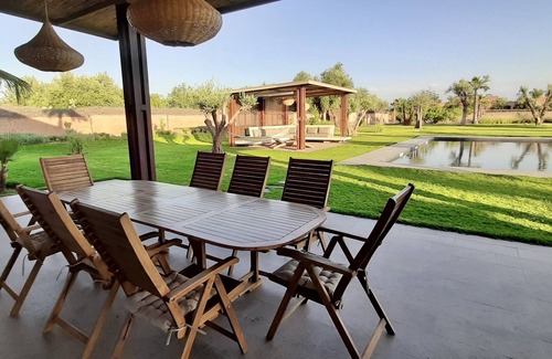 Located 10 mins from downtown Marrakech and yet offering a completely silent and peaceful environment, Villa Helios is a glimpse of paradise within the ocher city. This French designer of 500sqm villa features a 1 hectare garden and a 105sqm swimming pool, with a current total of 4 suite-sized bedrooms and a breathtaking view on the Atlas mountains. The name of Villa Helios comes from the house's main asset : sunlight. With large windows on all sides of the place, as well as a fully independent solar powered system, the villa produces more energy than what it actually requires, making it a positive energy housing. Its minimalistic setup and designer furniture made of Scandinavian elements, modern art and African photography inspiration will instantly make you travel and feel home at the same time.