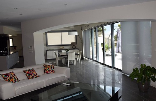 Royal is fully air-conditioned villa with facilities and high quality services. The ground floor is organized around a vast living space; living room, dining room, kitchen that opens onto a huge terrace with a large bay window with direct access to the heated pool. This space lit by a skylight is particularly appreciated by the layout and the equipment of its rather exceptional kitchen unit which combine ergonomics and design. The lounge, relaxing is decorated with white leather sofas where it is nice to prolong the evenings. This place friendly living is complemented by a room dedicated to relaxation with a magnificent spa of 5 places. A master suite with dressing room and en suite bathroom nestles on the west side of the house.