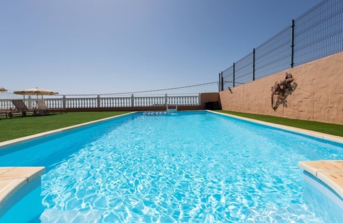 Escape to this stunning villa in Maspalomas, perfect for family gatherings or groups seeking relaxation and fun. With a spacious design, the property features a large heated pool, surrounded by a lush artificial grass area ideal for lounging or playing. Enjoy a variety of outdoor activities, including tennis, soccer, basketball, and ping pong, or unwind in the chill-out area with a barbecue. The villa offers ample space for up to 12 guests, plus 2 additional guests on a sofa bed. Inside, you'll find four beautifully designed bedrooms, each equipped with high-quality bedding for maximum comfort. The main house includes a fully equipped kitchen with modern appliances, a dining room with seating for 14, and a cozy living room with a smart TV. Two private cabins with independent access provide extra privacy, each with a terrace, en-suite bathroom, and air conditioning. The villa is perfect for a relaxing getaway, with a peaceful atmosphere just 15 minutes from Maspalomas Beach. For families with young children, cots and high chairs are available upon request. Additionally, the villa offers air conditioning in most rooms, Wi-Fi, and parking for multiple cars. The surrounding area is quiet and peaceful, allowing you to enjoy the tranquility of the island, while nearby attractions like shopping centers, golf courses, and beaches are just a short drive away.