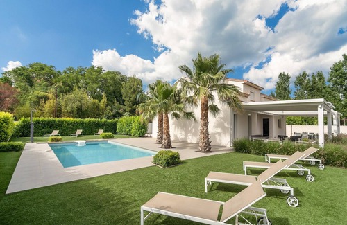 Enjoy a wonderful holiday amidst palm trees from this holiday villa in Occitanie, Languedoc-Roussillon. Located on the outskirts of the village of Saint-Geniès-de-Fontedit, the house (200 m²) is equipped with plenty of privacy and a large enclosed garden (1575 m²), a covered terrace and a private pool that can be heated from May to September for an extra charge of 200 euros per week.
