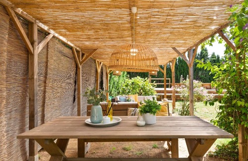 Layout: Ground floor: (Entrance(reachable from the outside), Sitting room(TV(flatscreen), dining table, seating area), open kitchen(hob, electric kettle, toaster, hood, coffee machine, oven, microwave, dishwasher, fridge-freezer, Juicer), bedroom(double bed), bedroom(single bed, single bed, single folding bed), bathroom(shower, washbasin, toilet, hairdryer), air conditioning, terrace, heating) dining table, tumble dryer, washing machine, garden doors, garden, garden furniture, deckchairs, deckchairs, swimming pool(private, outside, opened from Jan upto and including Dec), high chair, ironing board, iron